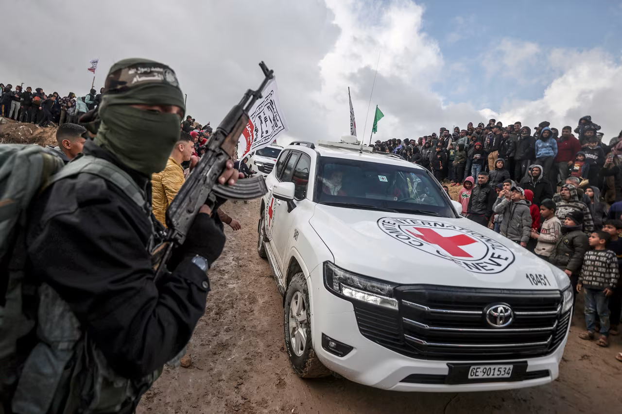 Members of the Hamas Al-Qassam Brigades prepare to hand over the bodies of the Bibas family and Oded Lifshitz under a prisoner-hostage swap agreement in Khan Younis, Gaza, on February 20.