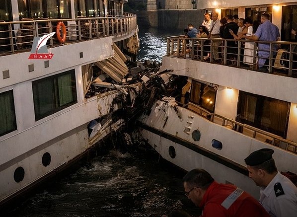 After passing through the Esna Lock by two kilometers, it was blindsided by a sharp maneuver from the ship “Beau Rivage,” which was traveling in the opposite direction from Luxor to Aswan.