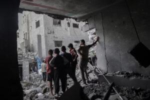 Palestinians look out from a damaged building following an Israeli airstrike at the Al-Shati refugee camp in Gaza City, northern Gaza, on Wednesday,