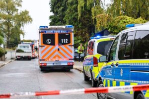 An ambulance and police cars wait near the site where Iris Stalzer was reportedly stabbed in Herdecke, western Germany, on Tuesday. Alex Talash/AFP/Getty Images