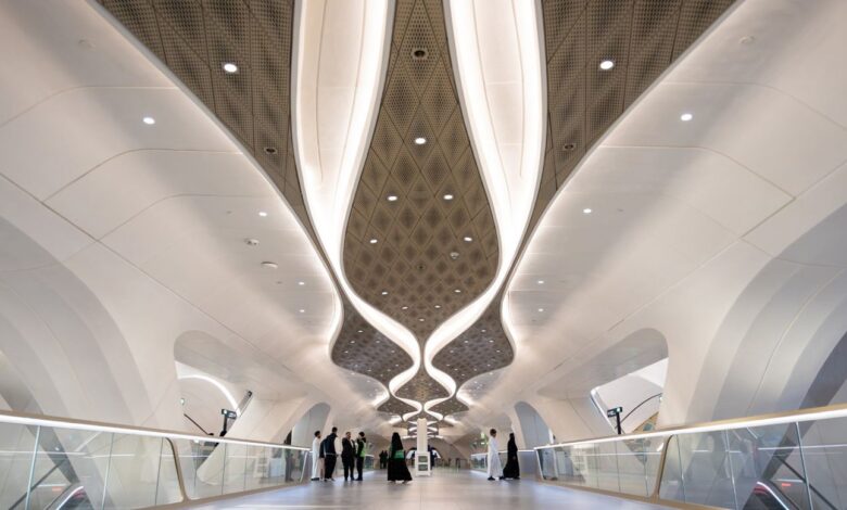 STC Station, which connects two lines, was designed by Germany’s Gerber Architekten, drawing inspiration from limestone formations in Saudi Arabia’s Tuwaiq mountains.