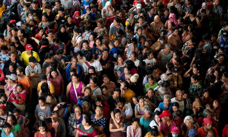 Residents who were evacuated ahead of Typhoon Fung-wong queue for food at an evacuation center in Cauayan, Isabela, Philippines, on November 9, 2025.