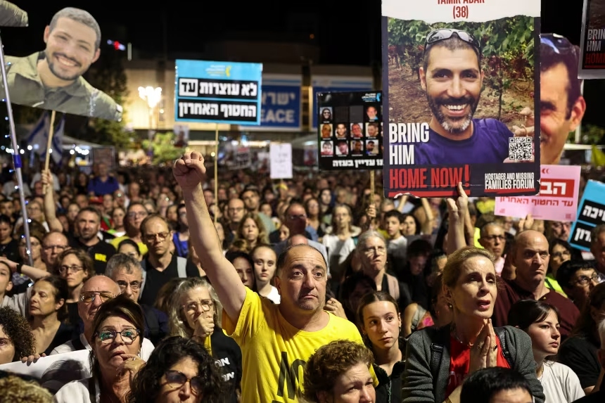People take part in a demonstration at Hostages Square in Tel Aviv on Saturday, calling for the release of all the bodies of hostages held in Gaza by Palestinian militant group Hamas. Fadel Senna/AFP/Getty Images