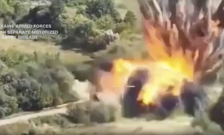 The video ends abruptly when the drone hits the stash. Footage filmed by a second camera from some distance shows a large explosion. CNN has geolocated the bridge seen in the video to the Belgorod region in southern Russia, near the border with Ukraine.