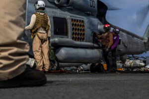 This photo provided by the U.S. Navy shows sailors fueling an MH-60R Sea Hawk helicopter on the flight deck of the Nimitz-class aircraft carrier USS Abraham Lincoln in the Indian Ocean on January 21, 2026.
