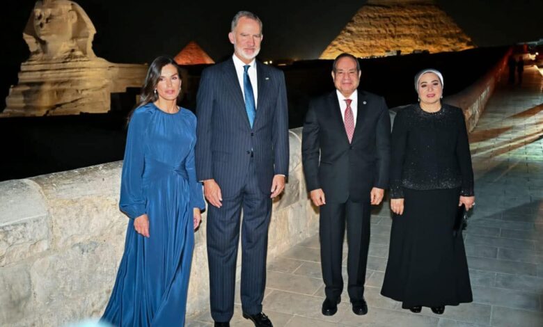 Egyptian President Abdel Fattah al-Sisi and First Lady Entissar al-Sisi hosted a dinner banquet on Wednesday evening at the Giza Pyramids in honor of King Felipe VI of Spain and his wife, Queen Letizia of Spain.