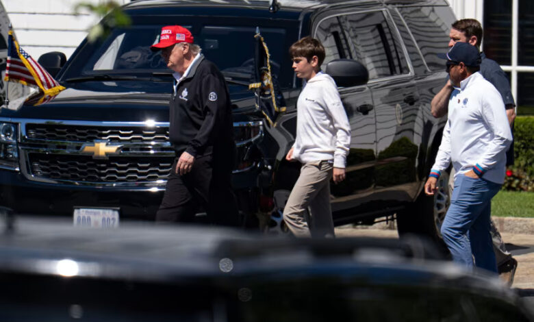 But on Saturday, he emerged, spotted by pool reporters in a white polo, black pants, and signature red “Make America Great Again” hat on the way to his Virginia golf club. Grandchildren Kai Trump and Spencer Trump were also along for the ride.