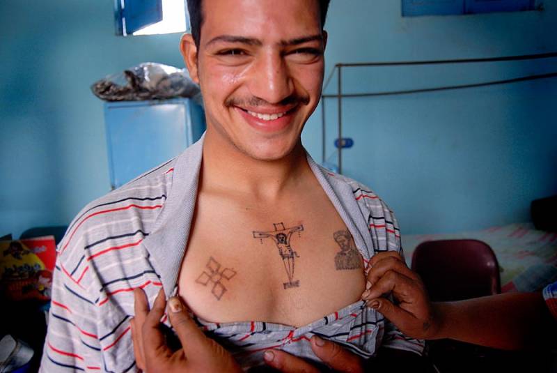 He is visiting his grandmother and shows off some of his religious tattoos.