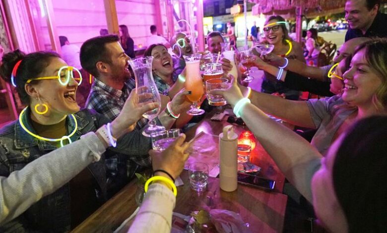 Image: Emily Baumgartner, left, and Luke Finley, second from left, join friends from their church group in a birthday toast to one of the members, upper right, during their weekly “Monday Night Hang” gathering at the Tiki Bar on Manhattan’s Upper West Side Monday, May 17, 2021, in New York. “Most of us live alone. and we need community. During the pandemic, we started hanging out in the park (Central Park) once a week. Once bars and restaurants reopened, we started coming back to Tiki Bar afterward. Under the latest regulations, vaccinated New Yorkers can shed their masks in most situations Wednesday. Restaurants, shops, gyms and many other businesses can go back to full occupancy if all patrons are inoculated. (AP Photo/Kathy Willens)