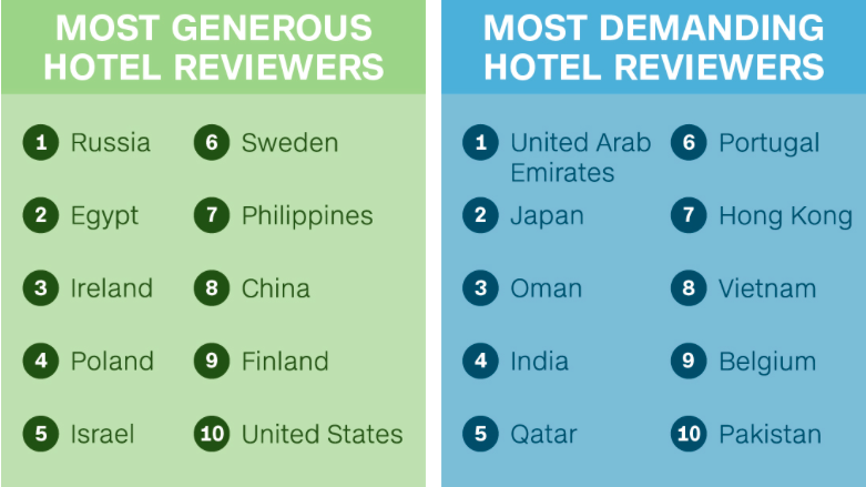 On the opposite end of the spectrum, Russian travelers have been ranked the most generous hotel reviewers, with their scores found to be .56 points higher than the global average.