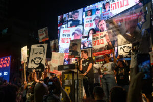 Ruby Chen, father of Itay Chen, speaks at the weekly 'Bring Them Home' rally in Hostages Square on October 11, in Tel Aviv, Israel. Alexi Rosenfeld/Getty Images