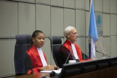 Presiding judge David Re, right, and judge Janet Nosworthy, left, pose for pictures prior to a session of the United Nations-backed Lebanon Tribunal where it is scheduled to hand down it’s sentencing on Salim Jamil Ayyash, a member of the Hezbollah militant group who was convicted of involvement in the assassination of former Lebanese Prime Minister Rafik Hariri and 21 others 15 years ago, in Leidschendam, Netherlands, Friday Dec. 11, 2020. Ayyash is not in custody and is unlikely to serve any sentence. (AP Photo/Peter Dejong, Pool)