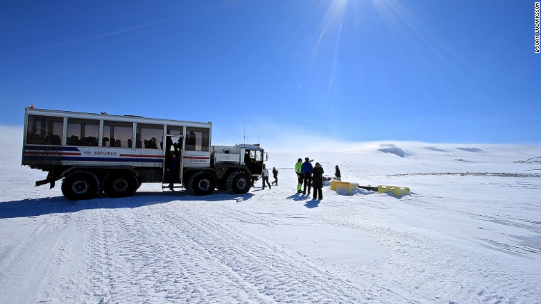 Guests board a 20-ton customized monster truck designed to traverse the soft, sloping snow and rocky ice of the glacier.