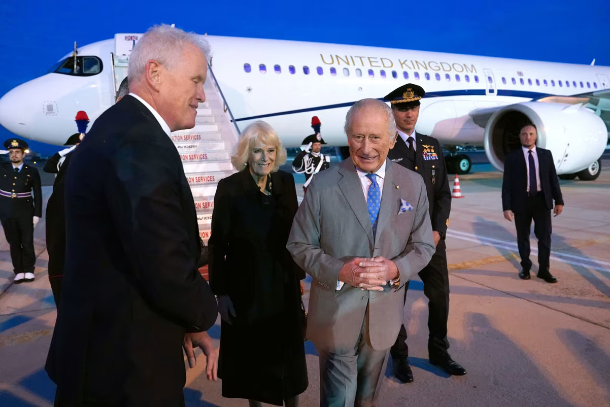 King Charles III and Queen Camilla are welcomed by British Ambassador to the Holy See Christopher Trott, left, after landing at Rome's Ciampino airport on Thursday. Pool/Getty Images