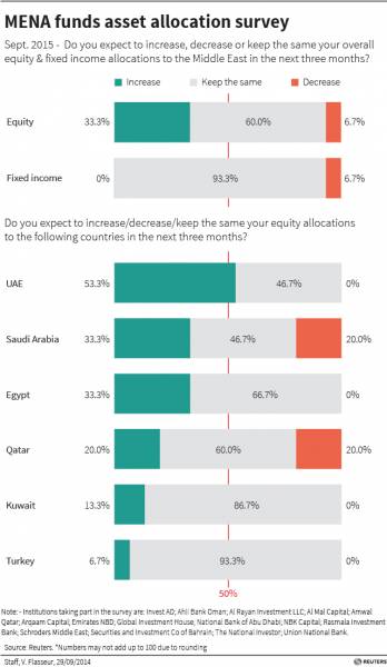 Fifty-three percent of fund managers in the latest survey said they expected to raise equity allocations to the UAE in the next three months, while none expected to cut them.