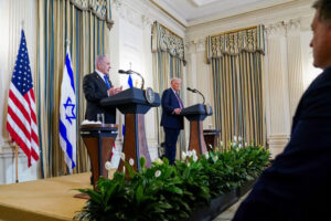 Israeli Prime Minister Benjamin Netanyahu, left, and US President Donald Trump hold a news conference in the State Dining Room of the White House on September 29, 2025.