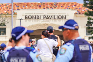 Police officers guard the perimeter as members of the public visit a memorial to pay their respects following a mass shooting attack that killed 15 people at Bondi Beach in Sydney on December 15.