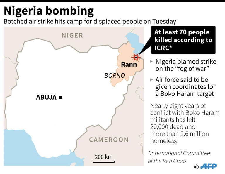 Nigeria's military has called the bombing a mistake and blamed "the fog of war". It said its intended target were jihadists reportedly spotted in the Kala-Balge area, of which Rann is part.
