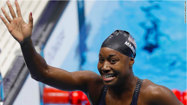 Simone Manuel became the first African-American woman to win a gold medal for the United States in an individual swimming event after she finished alongside Canada's Penny Oleksiak in a time of 52.70 seconds.