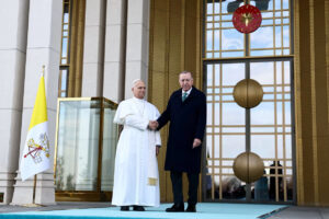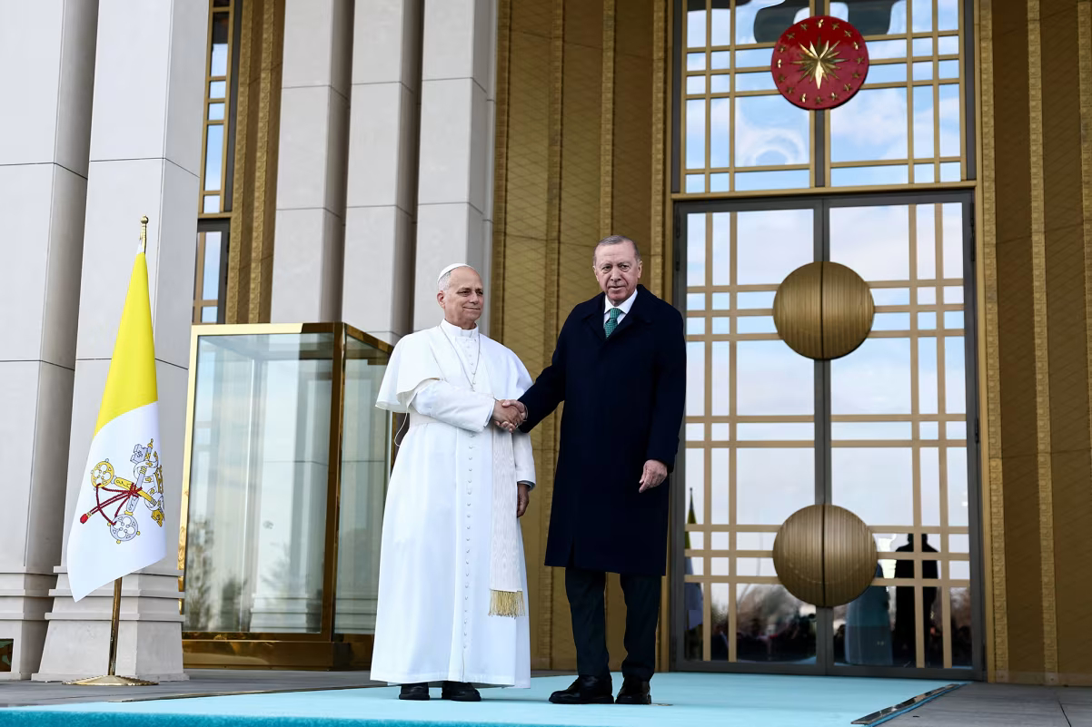 Pope Leo XIV shakes hands with Turkish President Tayyip Erdogan at the Presidential Palace, during his first apostolic journey, in Ankara, Turkey, on Thursday, November 27.
