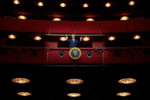 President Donald Trump looks down from the Presidential Box in the Opera House at the John F. Kennedy Center for the Performing Arts on March 17, 2025. Chip Somodevilla/Getty Images/File