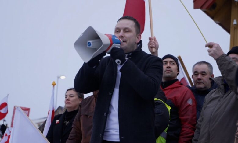 A protest kicked off later in Greenland’s capital of Nuuk. Just before 2 p.m. local time, there was an estimated crowd of 5,000 — a large proportion of the island’s population of 56,000. People waved banners saying, “Yankee go home” and “Greenland is already great.”