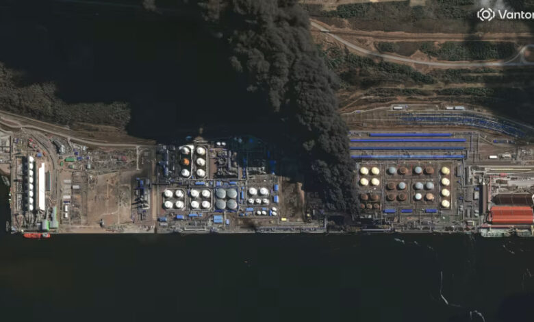 Geolocated video showed a large fire at the port, and the Russian Ministry of Emergency Situations warned residents in the nearby city of St. Petersburg of “air pollution” following the attacks.