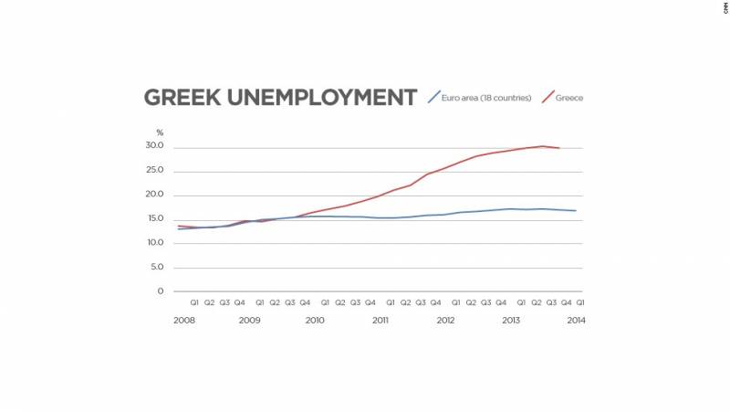 Unemployment rose to near 30%. Youth unemployment soared over 50%.