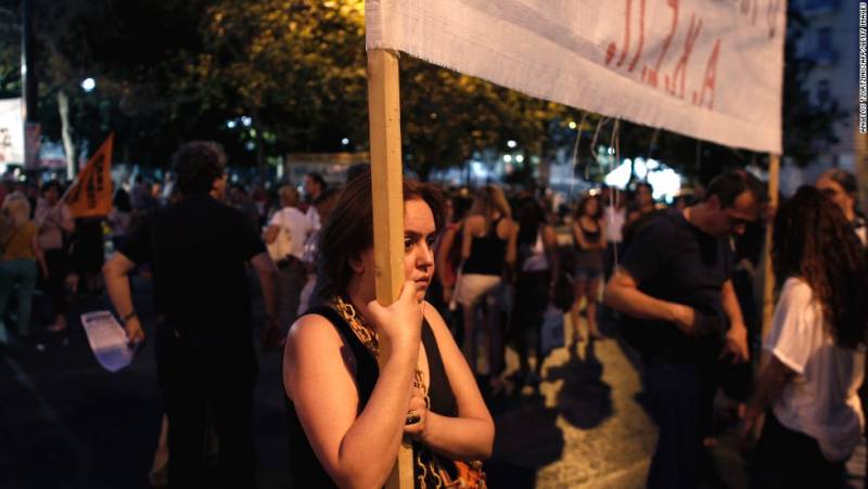 A protester, holding a banner against the Greek government, takes part in a demonstration in July 2013 in Athens.