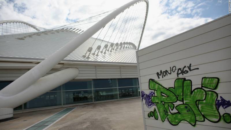 Graffiti marred the velodrome building in the 2004 Olympic Games Complex in February 2012 in Athens, Greece. What was once viewed as a triumph for Greece is seen as having played a role in the country's economic nosedive.