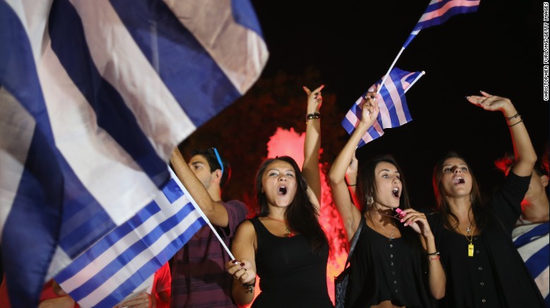 People celebrate in front of the Greek parliament in Athens on Monday after voters rejected a debt bailout by creditors.
